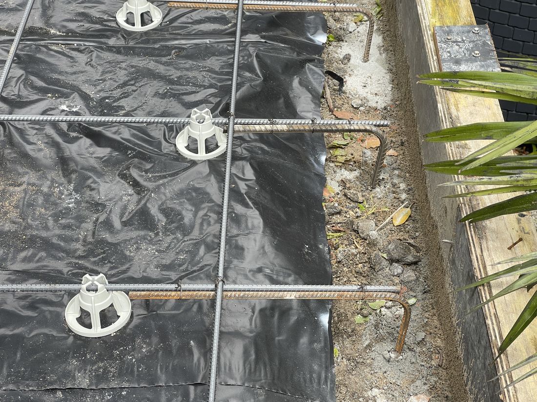 Blue metal base for drainage, plastic, steel and chairs installed ready for the pour.