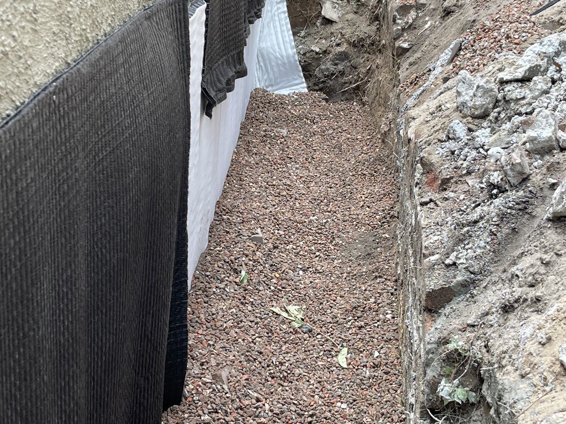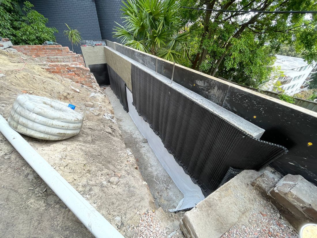 3 layers of waterproofing was painted on the back of the walls, new membrane with attached geocloth was pinned to the walls and aggregate, agg lines and more geocloth back filled the walls before pouring.